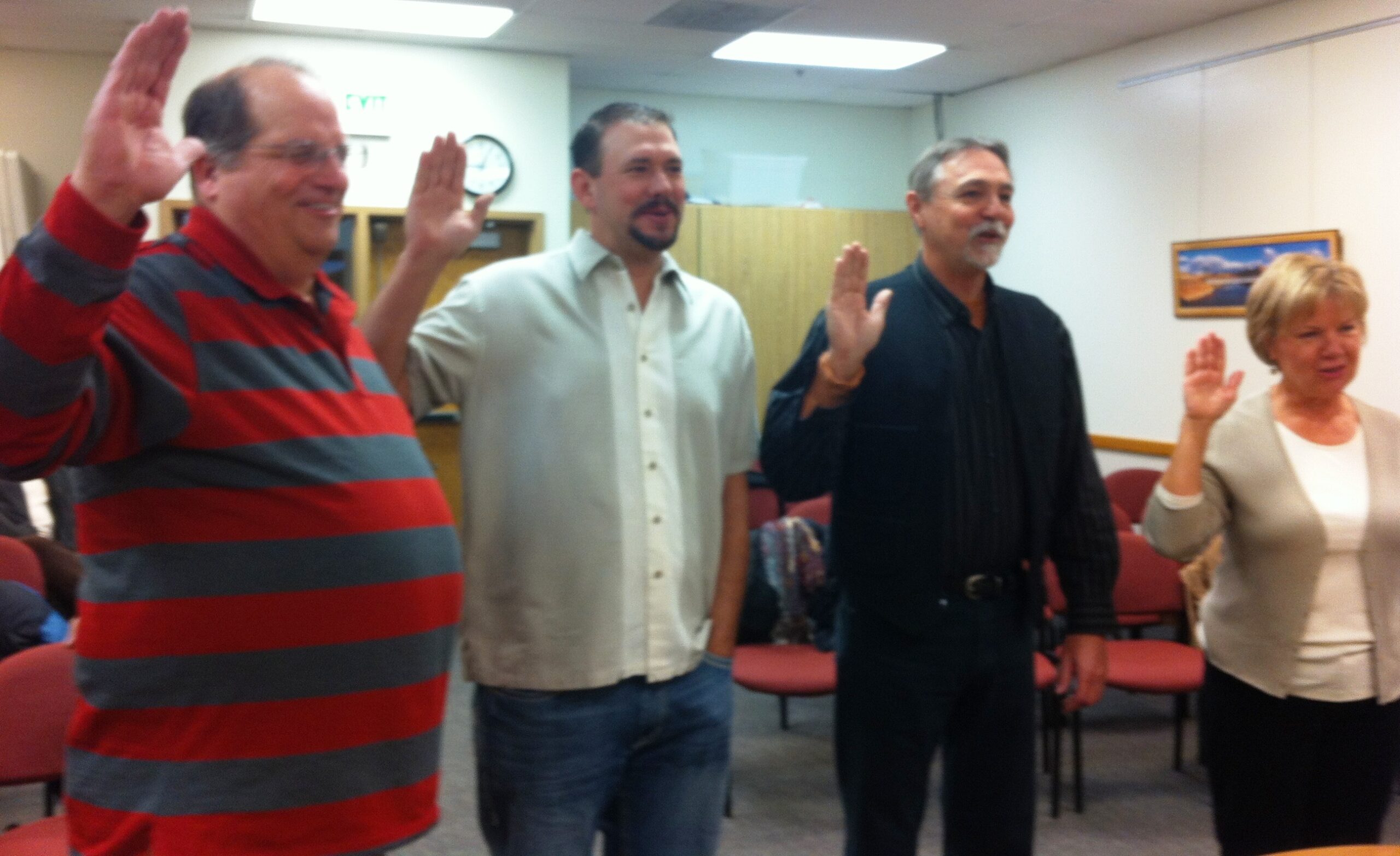 Ken Ballantyne, Rory Paxman, Lynn Jackson and Elizbeth Tubbs were sworn into the Grand County Council the morning of Wednesday, Jan. 2. This is Ballantyne’s fourth term as a county councilman. He served two terms between 1993-1998 and a third term between 2008 and 2012. Paxman, Jackson and Tubbs are now beginning their first term. [Photo by Kristin Millis/ Moab Sun News]