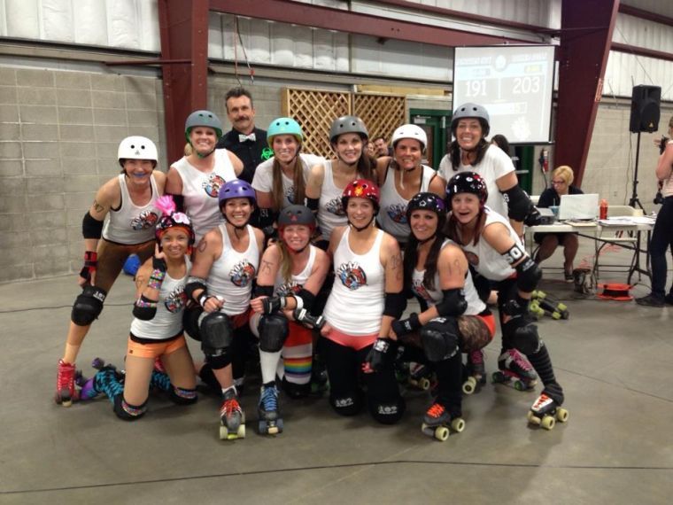 Moab Roller Derby beat Junction City Roller Girls in Ogden during a tightly matched game with multiple lead changes. Moab pulled ahead in the last jam to take the win 203 to 191 on Saturday, April 27. Front row from left to right: Andrea “MILF Marauder" Lopez, Sariah "Whiplash" Ellsmore, Heather "Track Hoe" Perry, Jessica "Evil Lucian" O'Leary, Ann "BreakHer" Rightsell, Jamie "Bratty Cakes" Simpson. Back row from left to right: Jazmine "Ready r Knot" Duncan, Lindsay "Mad Eye Molly" Brian, Steve Heath, Deanne "Kickin' Assets" Evans, Nicole "Pain in the Nikki" Parker, Maureen "Mosama bin Lappin" Clapper, Maddie "Rockin the Floss" Berserra.Not pictured, Andrea “Hot Pantz” Jackson. [Maddie Berserra / Photo courtesy Moab Roller Derby]
