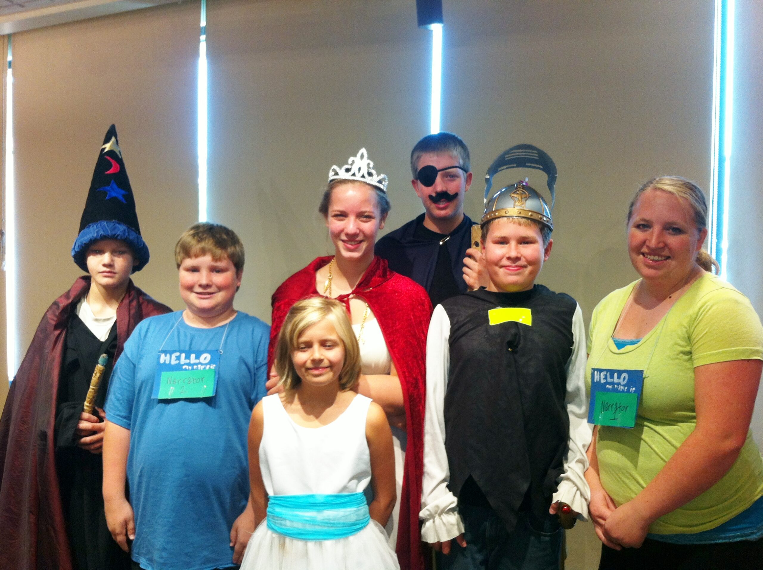 The cast from “Dealing with Dragons”, a play produced through the BEACON Afterschool Program and the Grand County Public Library, pose for a photo after their dress rehearsal held Saturday, June 6. From left to right: Michael Johnson, Gail Leavitt, Katie Weiderhold, Emma Millis, Nathan Shafer and director Ashly Hunter. Their main performance will be held at 2 p.m., Saturday, July 13 at the Grand County Public Library. [Kristin Millis / Moab Sun News]