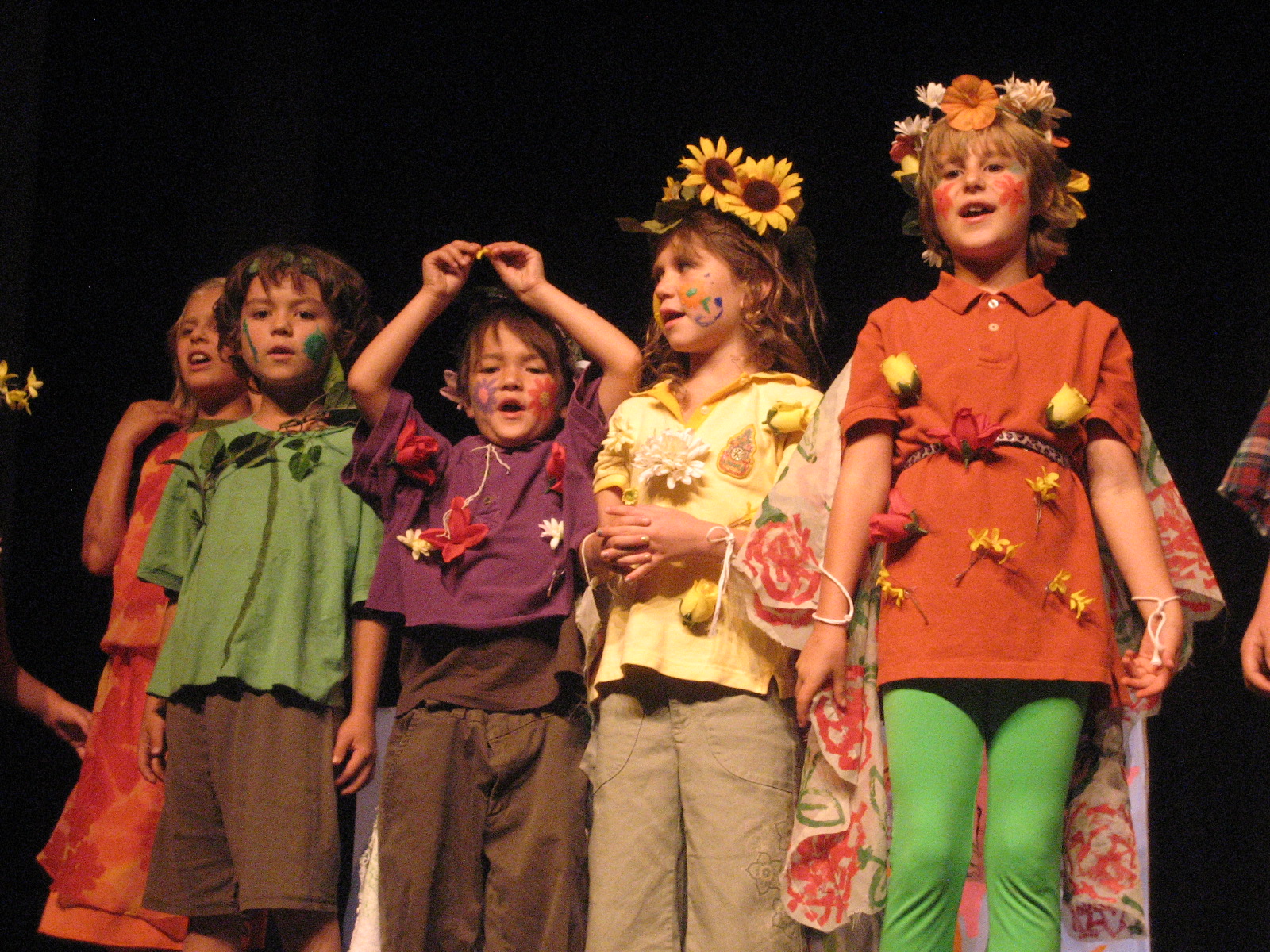 The Flower Patch characters singing during the Youth Garden Project Summer Camp play, “Harvest Time” held Friday, July 19 at Star Hall. From left to right: Katie Wiederhold, Kaleb Klatt, London Han, Taryn Han and Rachel Diehl. The Youth Garden Project Summer Camp program performs an original play for the community each summer. [Photo Courtesy / Youth Garden Project]