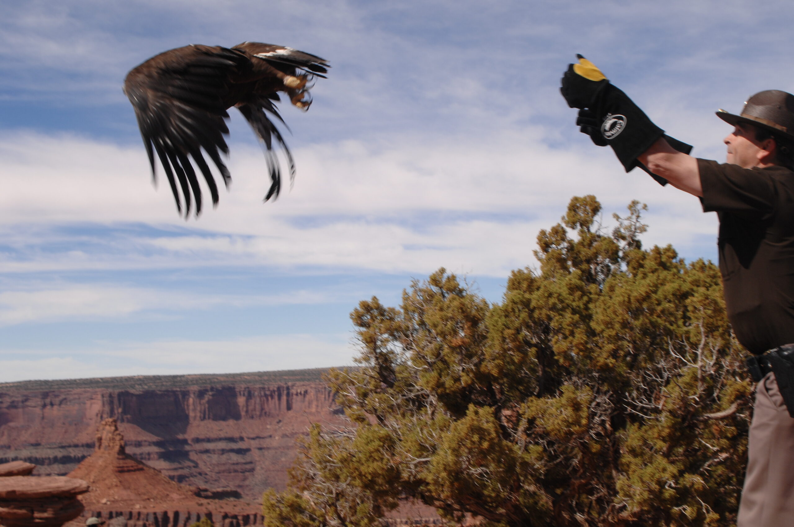 Utah Highway Patrol trooper Brian Evans releases a rescued golden eagle into the wild on Sunday, March 9 at Dead Horse Point State Park. Evans originally discovered the eagle after it had been struck by a vehicle on U.S. Highway 191 north of Moab in July 2013. Evans turned the injured bird over to Second Chance Wildlife Rehabilitation in Price. The organization, headed by Debbie Pappas, spent months caring for the eagle prior to its release. A second eagle rescued from Carbon County was released the same day by the Second Chance’s Moab events coordinator Yrma van der Steenstraeten. [Photo courtesy of Second Chance Wildlife Rehabilitation]
