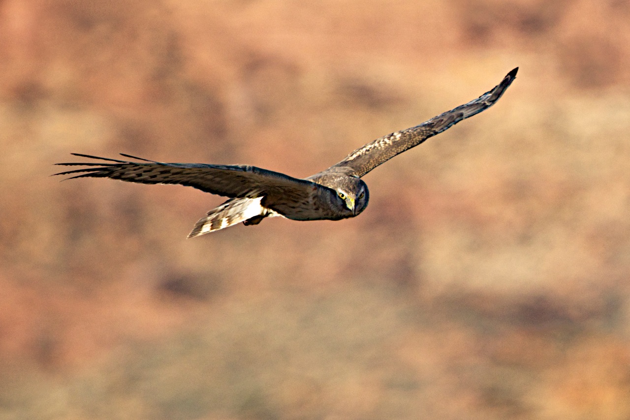 A Northern Harrier (also known as a marsh hawk) photographed using a telephoto lens near the Scott M. Matheson Wetlands Preserve last week. A bird of prey, it is found in large, open fields and marshes, flying low to the ground, and is easy to identify by its bright white rump. The Harrier possesses two owl-like features – a round facial disc aiding in directional hearing to locate prey, and soft feathers which provide for stealthy flight. [Photo by Mike Newbold for the Moab Sun News]