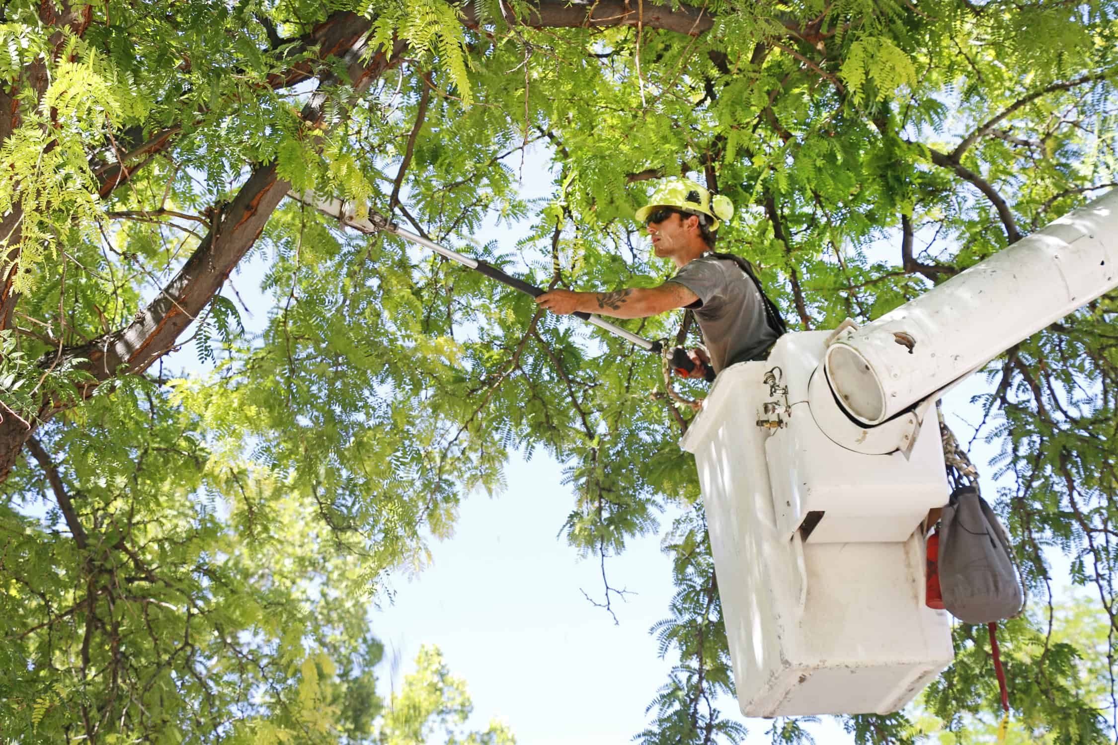 Sam Finco of Triassic Tree Service trims a locust tree in front of the Grand County Sheriff's Office on Thursday, June 19. Triassic owner Scott Anderson says all tree material is recycled into wood chips, firewood, or is used locally to make furniture, kitchenware and jewelry, some of which are sold at Triassic's store at 7 N. Main St. [Photo by Bethany Blitz / Moab Sun News]