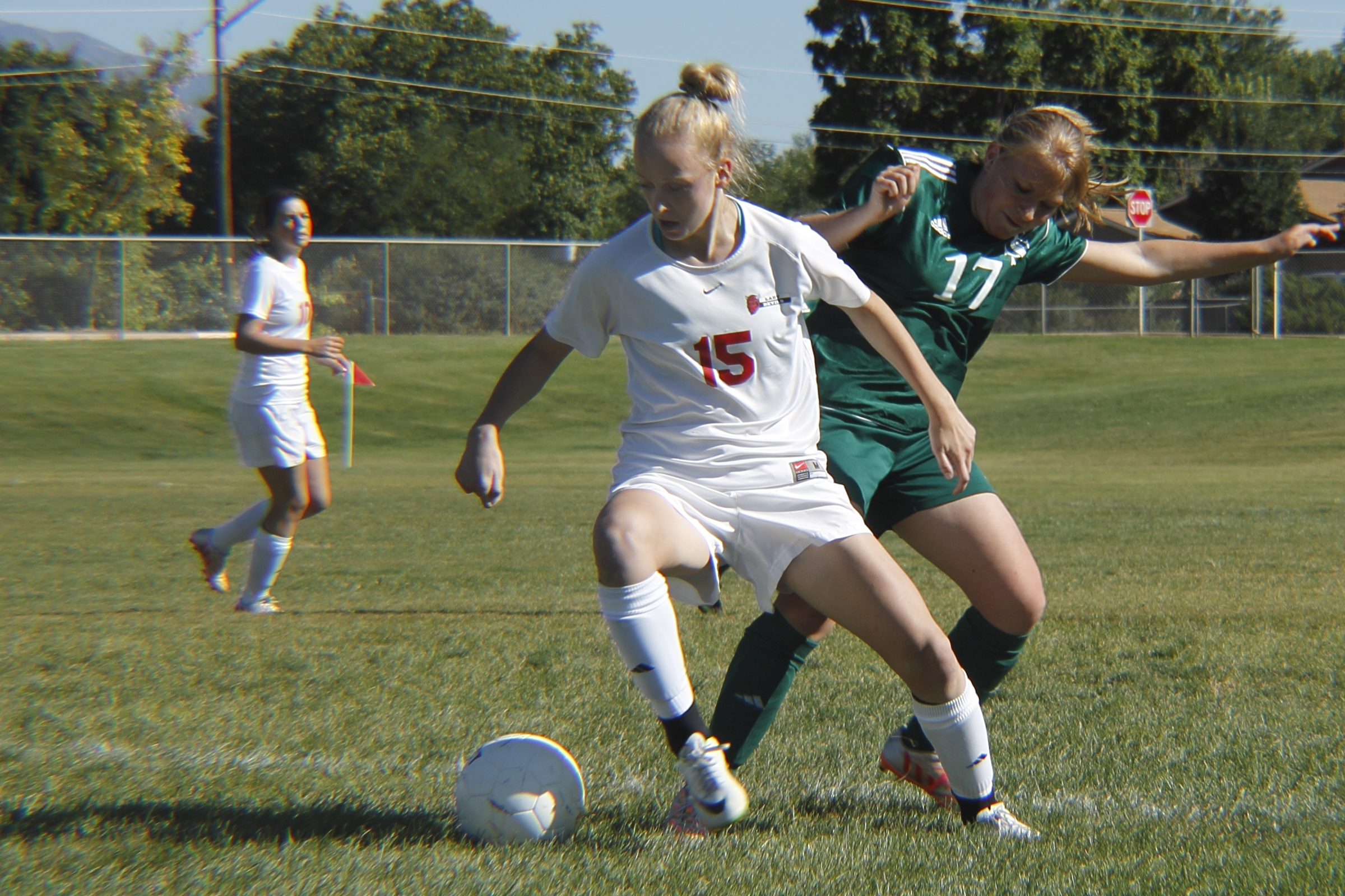 Lady Red Devil soccer player Cheyenne Shumway battles for the ball with South Summit’s Erin Peterson on Thursday, Sept. 18, in a game Grand won 1-0 to improve to 3-2 on the season. The Lady Red Devils also defeated Gunnison 3-1 on Tuesday, Sept. 16, getting goals from Heather Sweeney, Skyla Sheldon and Taitum Cook. Sheldon scored the lone goal in the victory versus South Summit. Grand was also scheduled to play host to Manti on Tuesday, Sept. 23. They’re scheduled to play American Leadership Academy in Moab on Thursday, Sept. 25, before playing host to North Sevier in the Homecoming Game on Tuesday, Sept. 30. [Photo by Nathan Wynn / Moab Sun News]