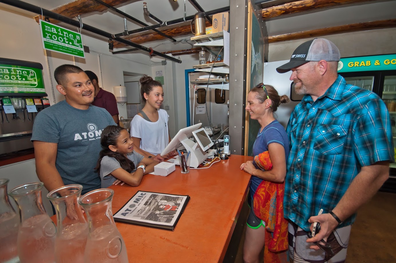 On Father’s Day, Atomic Grill and Lounge General Manager Pitak Hollmann gets a big assist from his daughters, Analyza and Lia (cashier), who take the food order of Katie Joy and T.L. Collins (right) from Grand Junction, Colorado. The Atomic is known for its craft cocktails, and the diverse American and Southwestern cuisine of Chef Tim Buckingham. It is open daily for lunch and dinner and is located at 1393 N. Hwy 191. [Photo by Murice D. Miller / Moab Sun News]