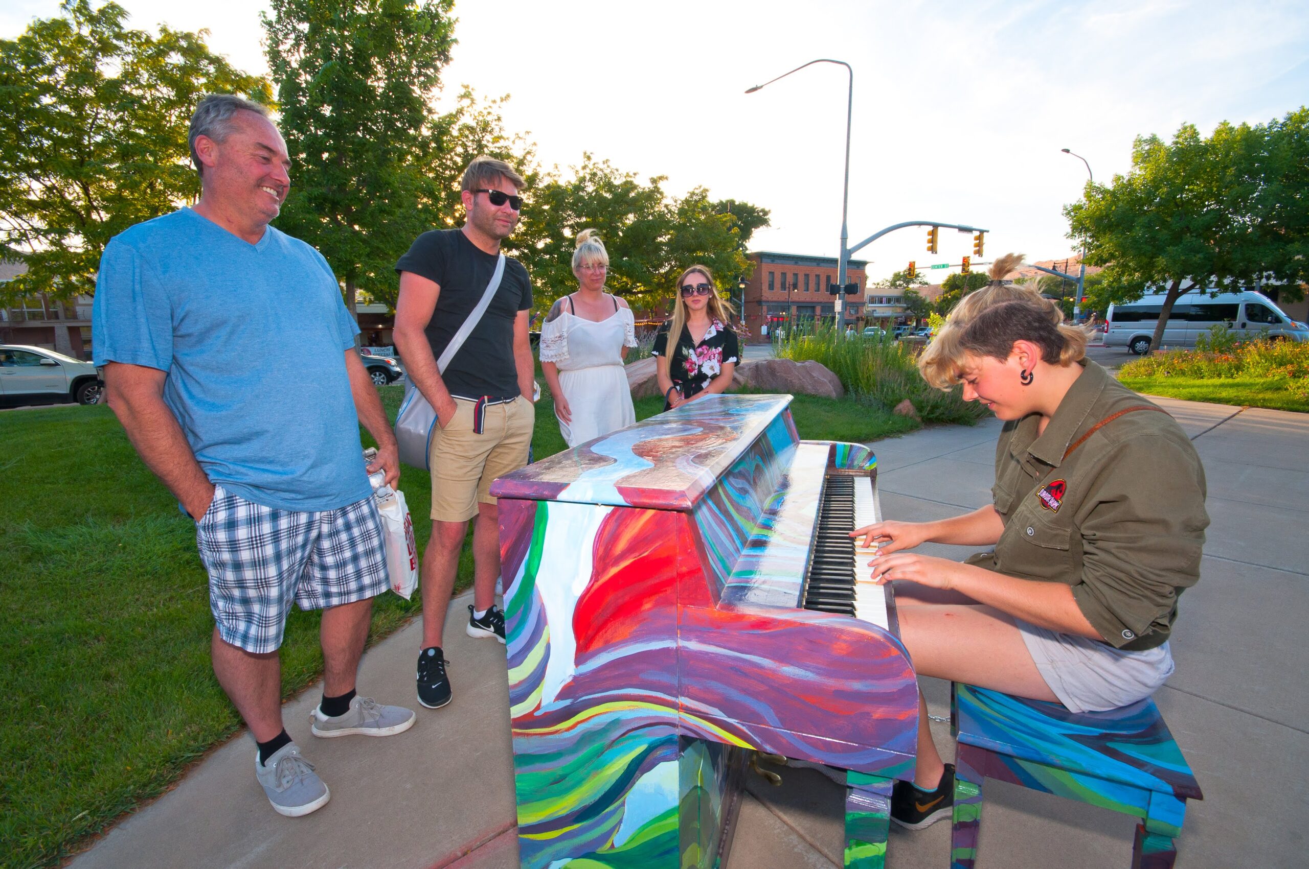 Galatea Boardman-Sells plays the piano outside the Moab Information Center on Wednesday, July 17, while her family enjoys. [Photo by Murice D. Miller / Moab Sun News]