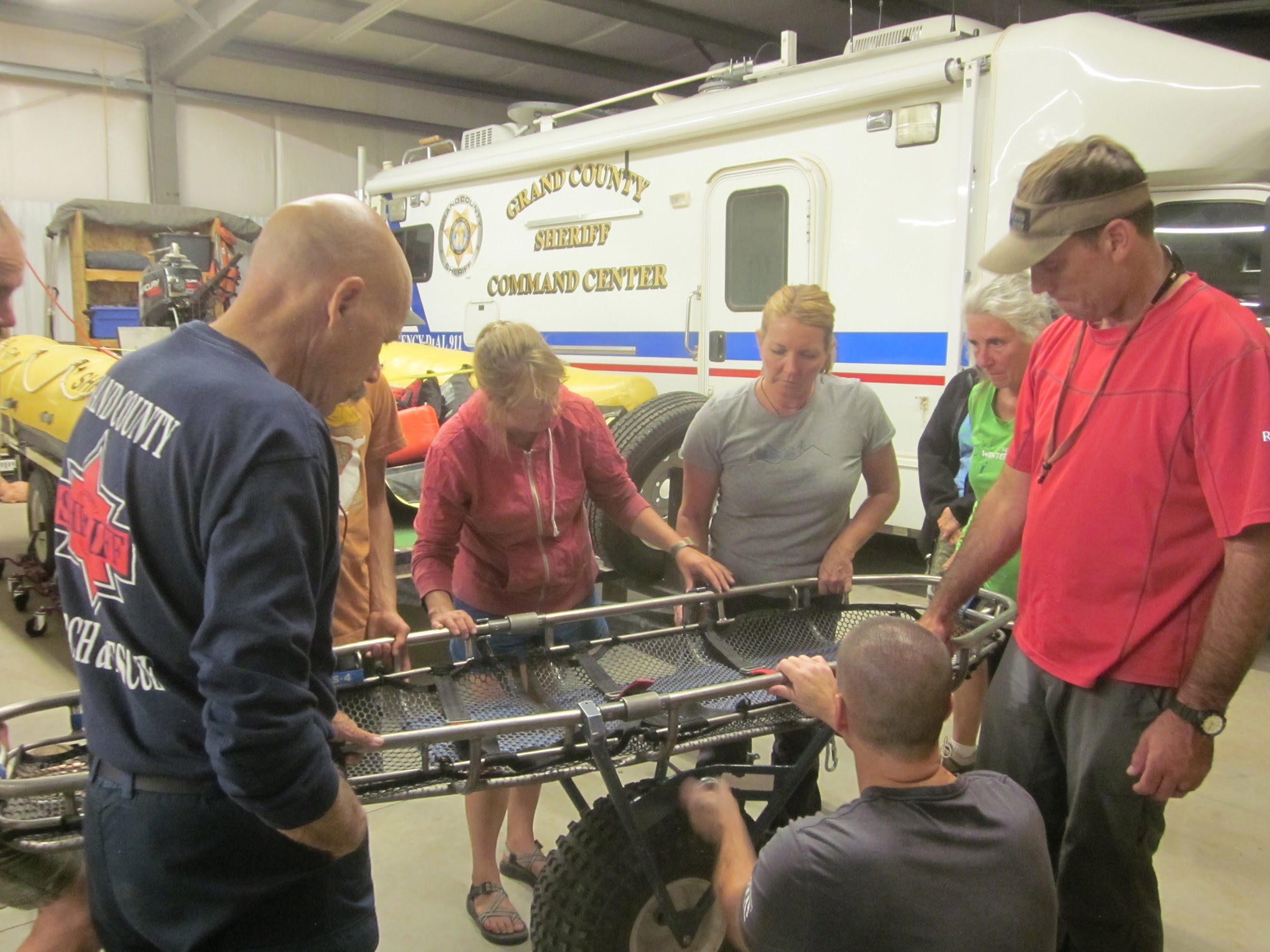 During a recent training, a crew of Grand County Search and Rescue team members practiced transporting “patients” in a one-wheeled litter.