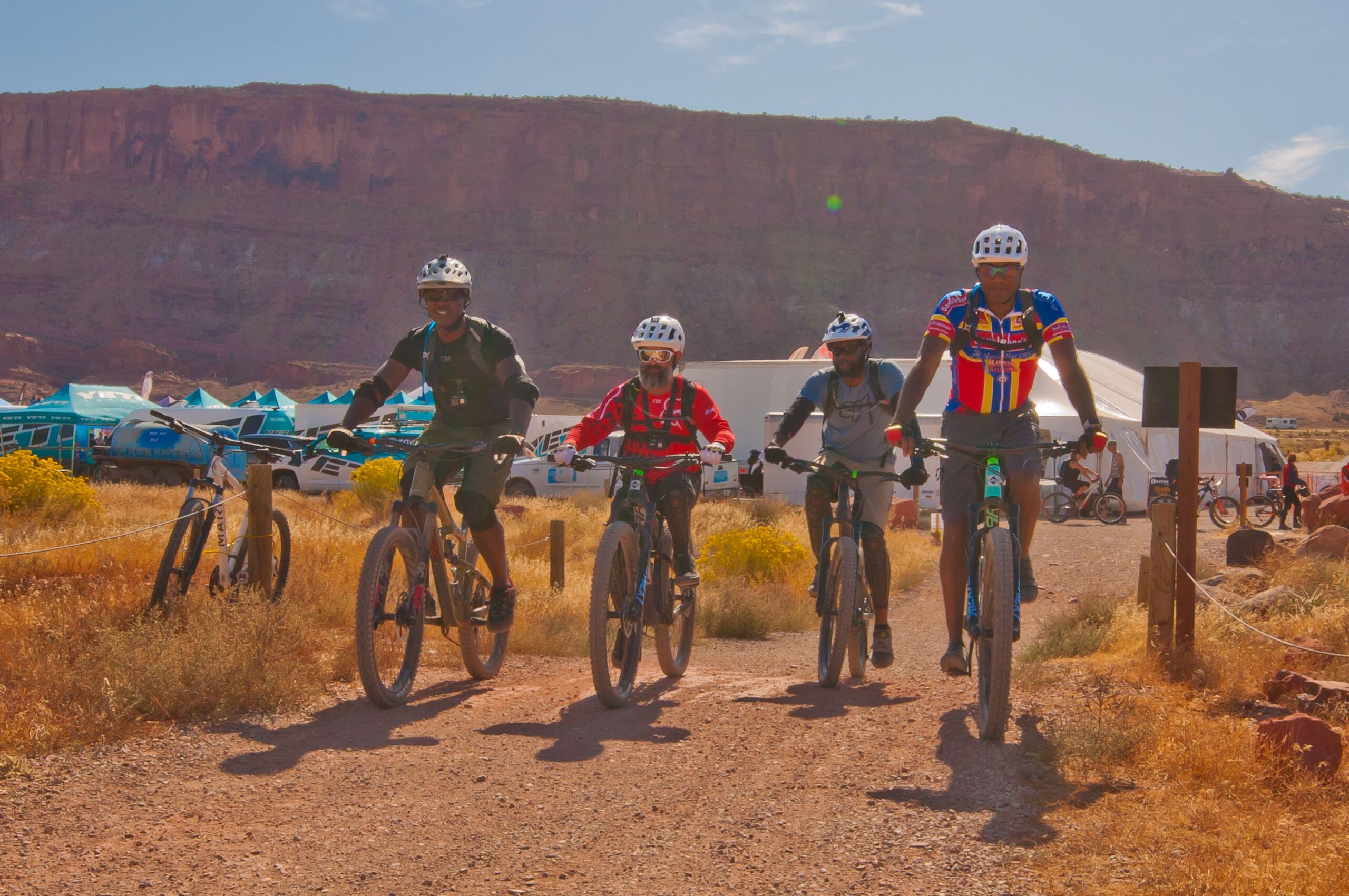 Richard Simpson, Japhet Colon, Robert Brooks and Ainsley Thompson of Connecticut enjoyed the bicycle demonstration event Outerbike at the Bar M Trail. Outerbike is organized by Moab-based Western Spirit Cycling Adventures and partner organizations. The event took place Oct. 4-6. This was its 10th year. [Photo by Murice D. Miller / Moab Sun News]