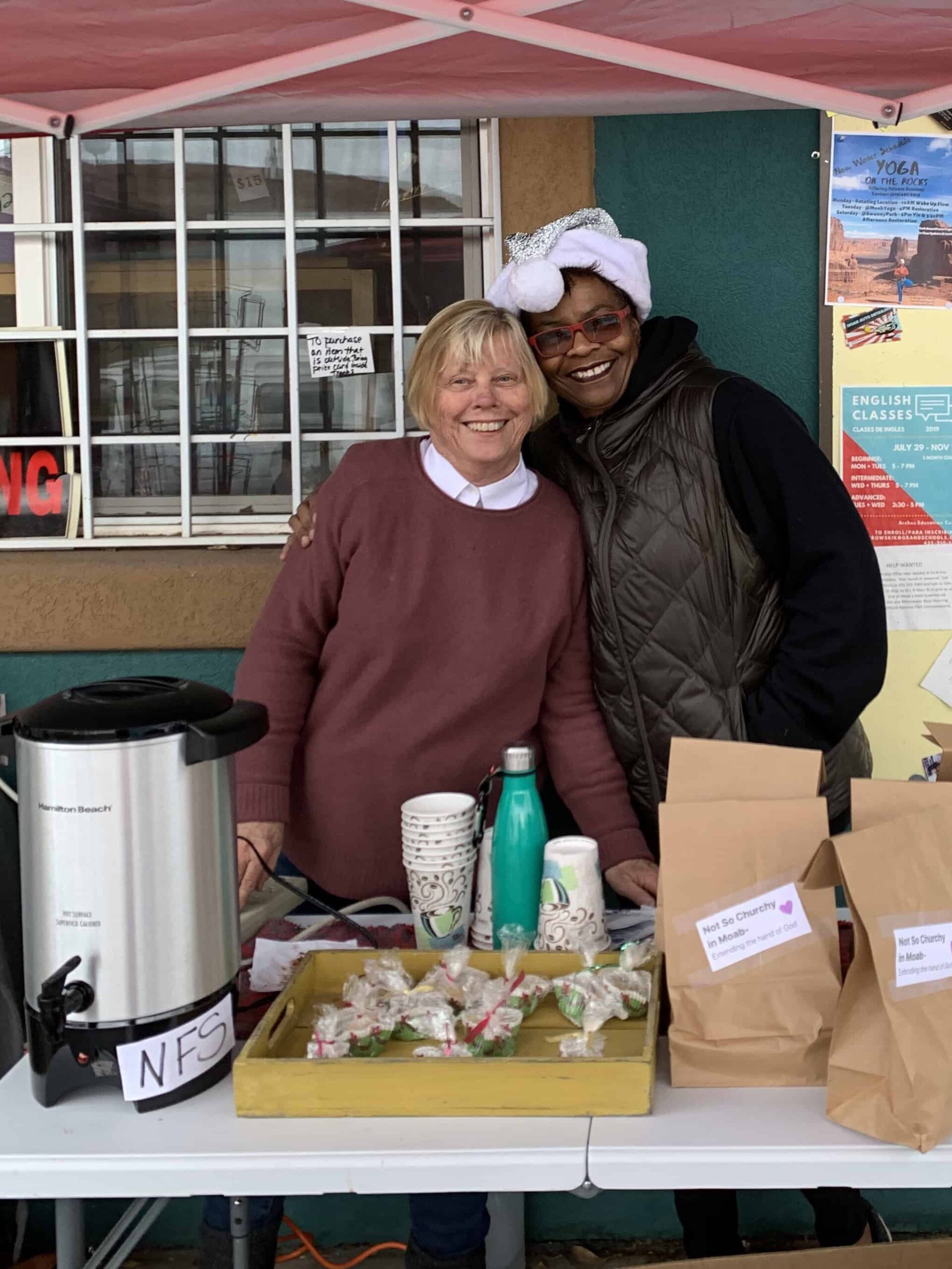 On Dec. 14, Pastor Linda Skogrand (left) and Michele Johnson of Not So Churchy in Moab distributed free bagged lunches in front of nonprofit thrift store Wabi Sabi. The lunches included ham and cheese sandwiches, mandarin oranges and trail mix bars. They also served hot chocolate and homemade sweet treats. Skogrand said the goal was “to do something for the community” and reported “hugs and thank yous.” She said the church plans to do similar events on a regular basis, but are still working out the details. Those interested in participating may call or text Skogrand at 435-760-4301. [Photo courtesy of Linda Skogrand]