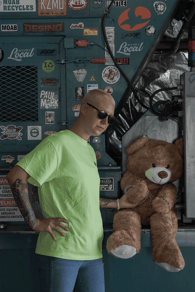 The images are also meant to be lighthearted—in one, a sanitation worker is depicted putting handcuffs on a teddy bear. She photographed workers at four locations: the Community Recycling Center, Transfer Station, Moab Landfill, and Klondike Landfill.