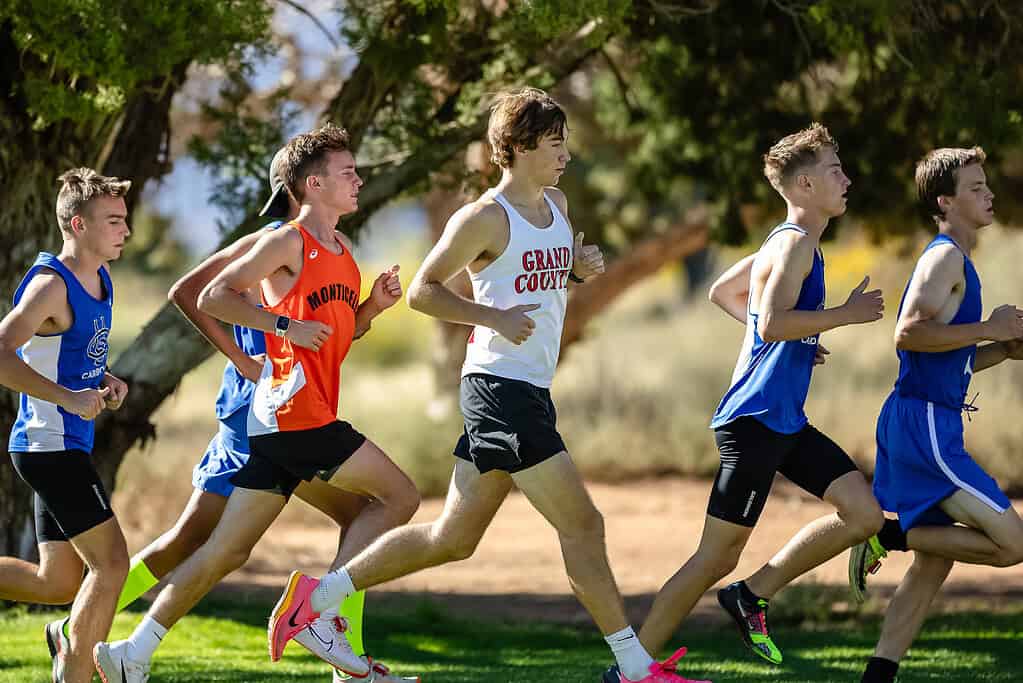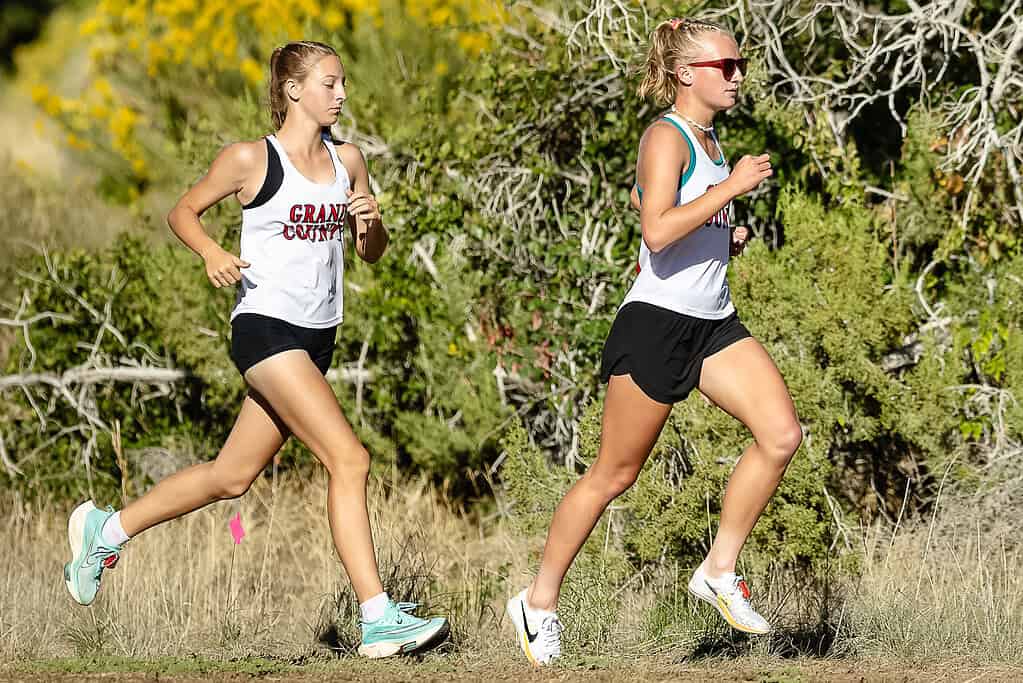 The Red Rocks Invitational cross country race took place on Sept. 27 at the Moab Golf Club. The Margaret L. Hopkin Middle School team competed against teams from Albert R. Lyman Middle and Monticello Elementary; the Grand County High School team against a number of regional high schools. Four HS varsity girls placed within the top ten of the 5,000 meter run: Cadence Kasprick, Ainsleigh Kasprick, Gemma Phillips, and Mia MicKay. Two HS varsity boys placed within the top ten of the 5,000 meter run: River Shaw and Rowan Phillips. [Jason Strother, jsmedia.io/Moab Sun News]