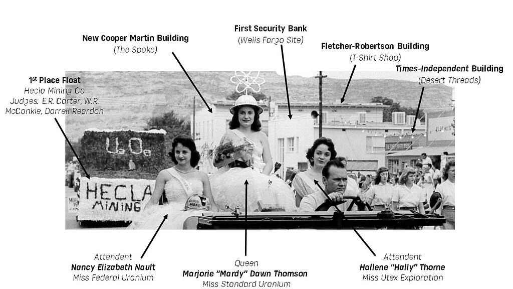 Marjorie “Mardy” Dawn Thomson (b. 1936), Miss Standard Uranium, was named the inaugural Uranium Queen in 1956. She later married William H. Lewis in Moab. Nancy Elizabeth Nault (b. 1939), Miss Federal Uranium, was named Mardy’s attendant (left in the image) and later married Moab’s Garry Joe Day. Hallene “Hally” Thorne (b. 1939), Miss Utex Exploration, was named Mardy’s second attendant (right in the image) and later married Olin T. Glober in Moab. All three attended Grand County High School; the two attendants graduated in 1958 and the queen graduated a year earlier.