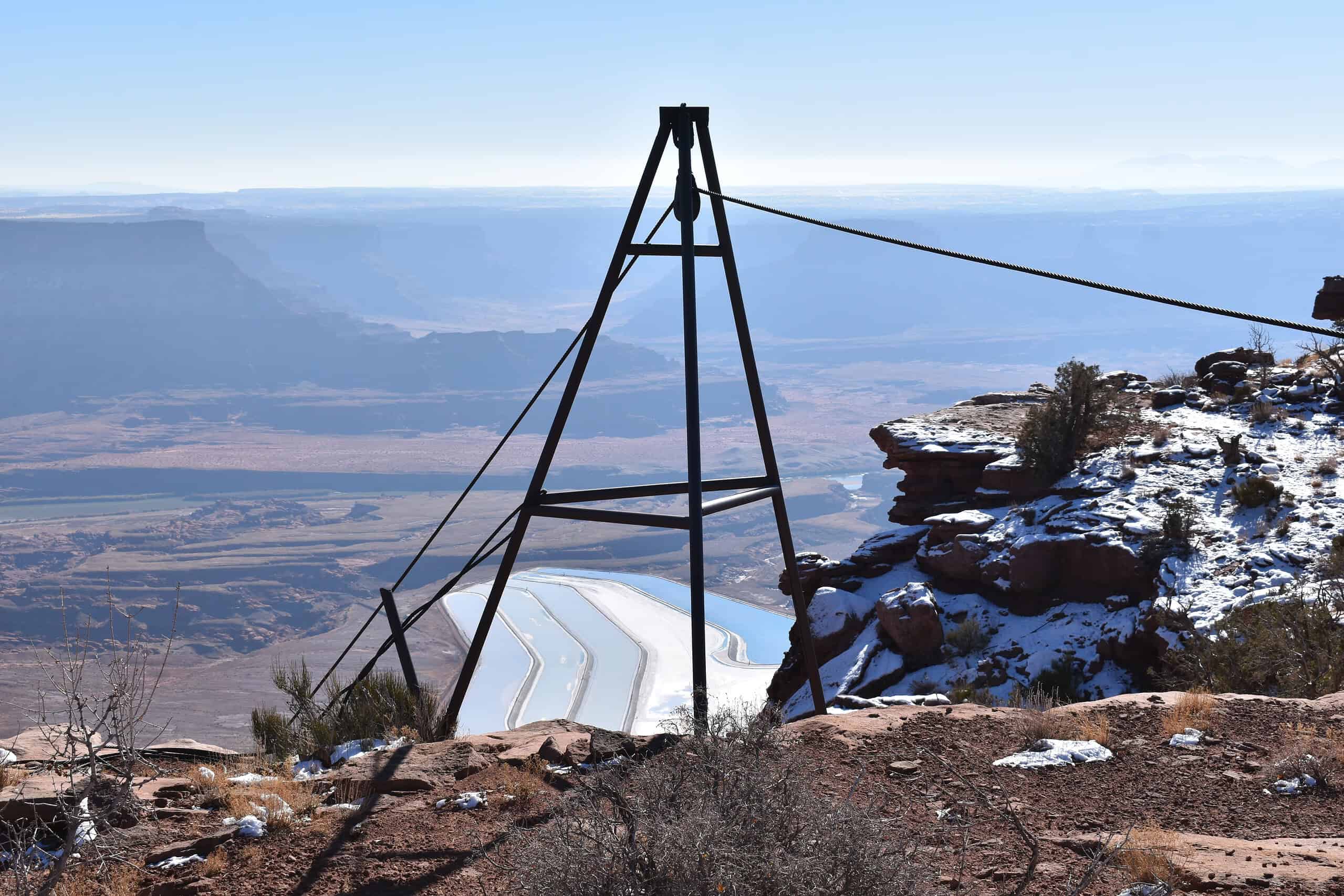 On a sunny November day, patches of snow from the previous night sparkled between shrubs clustered along the rough, sandy road toward Miner’s Point. Throughout a moderate walk following red survey flags, a thick, braided-metal cable poked in and out of the sand. The hike led to the edge of the mesa, where a rusted metal tripod perched hundreds of feet above the river canyon and the Intrepid Potash evaporation ponds, a heavy-duty pulley hanging from its peak.