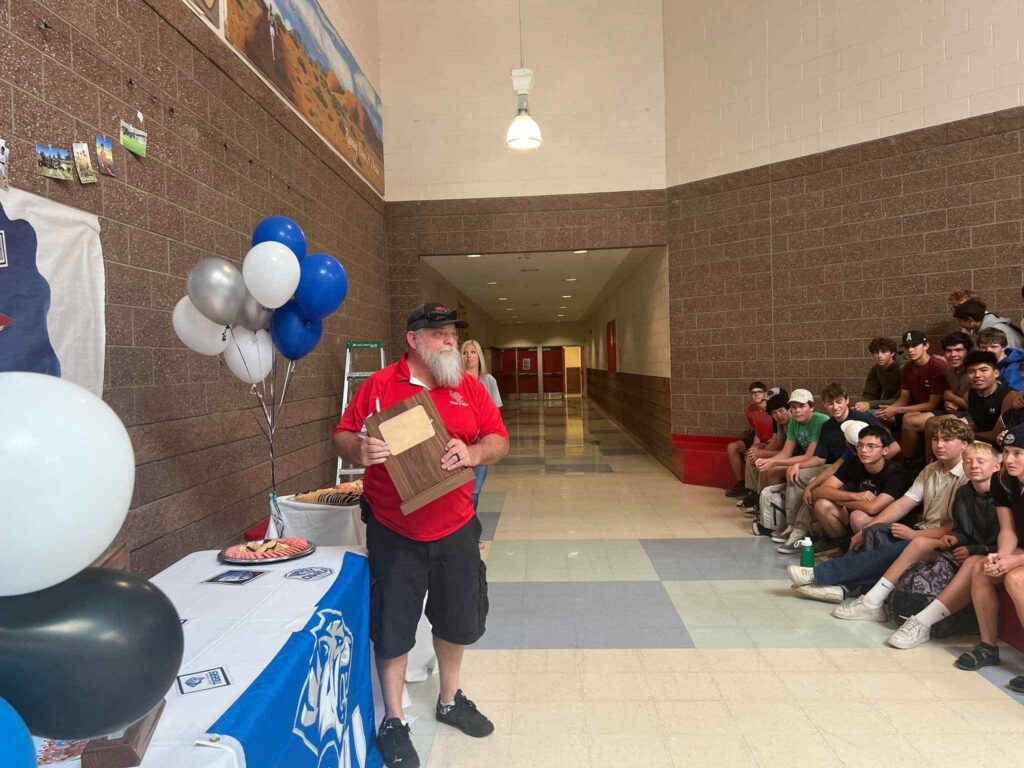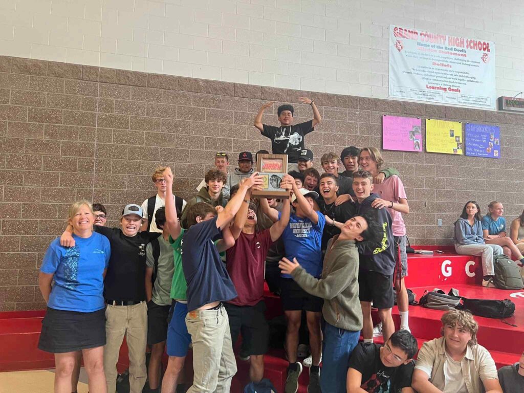 Grand County High School made a Grand presentation today to the boys soccer team. They had another outstanding season going 9-1 in the 2A South Division to win the title. AD Dolphin presented the trophy to head coach Reed, who then celebrated with the team surrounded by students applauding their achievement. RDP!!