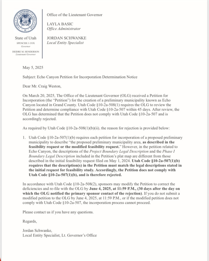 On May 5, the Utah Lieutenant Governor’s Office officially rejected the incorporation submitted by the developers, citing inconsistencies in the legal boundary descriptions. According to the state’s determination letter, the boundaries outlined in the petition did not match those submitted in the original feasibility study from May 2024, as required by Utah law.