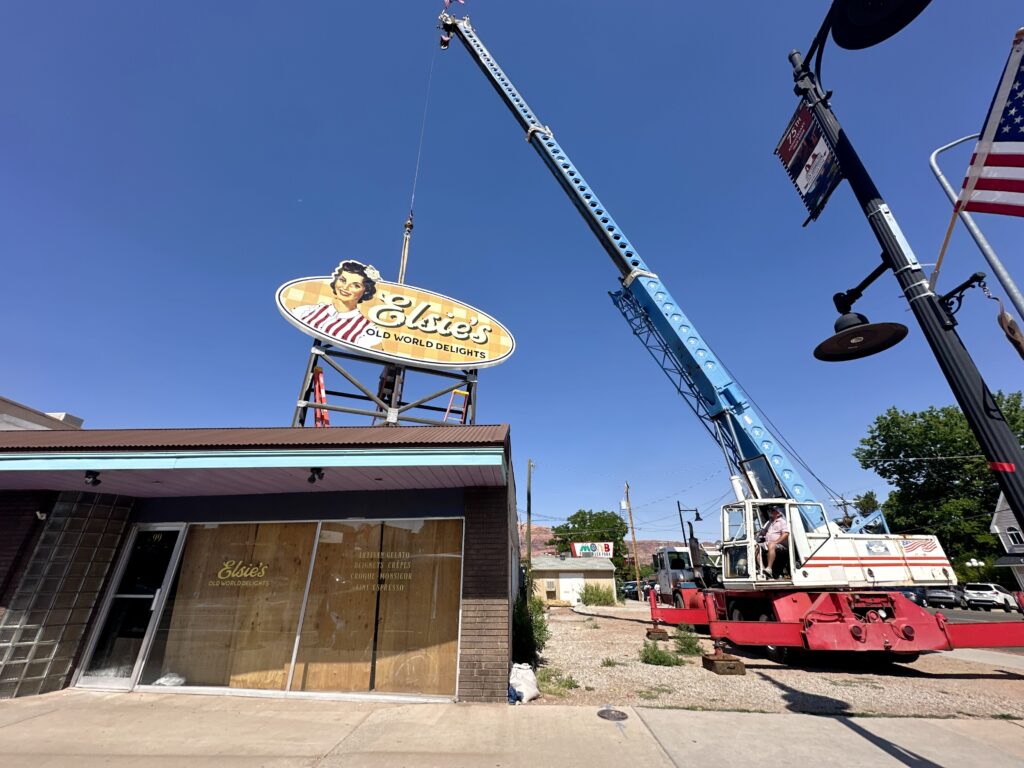 A large rooftop sign was installed today at 87 North Main Street, part of a new downtown business project from longtime Moab restaurant owner Will Petty. The steel-framed sign, mounted above the roofline, is the first to go up under a recent change to Moab’s sign code approved in January.