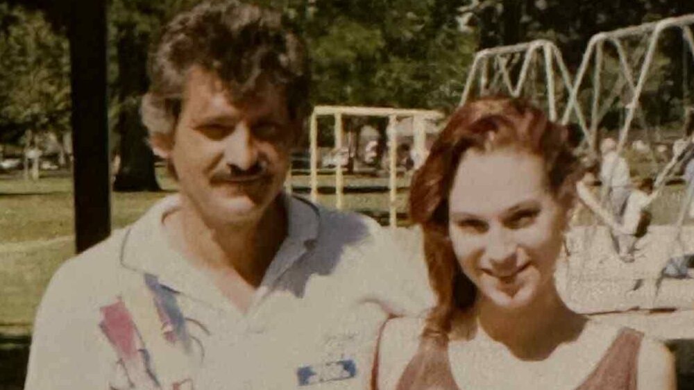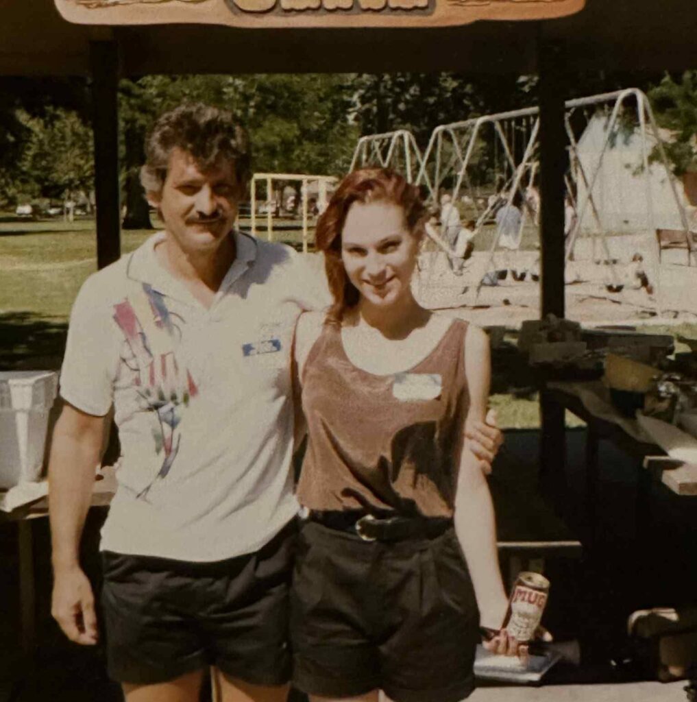 A smiling couple poses in a park on a sunny day with swings and picnic tables in the background.