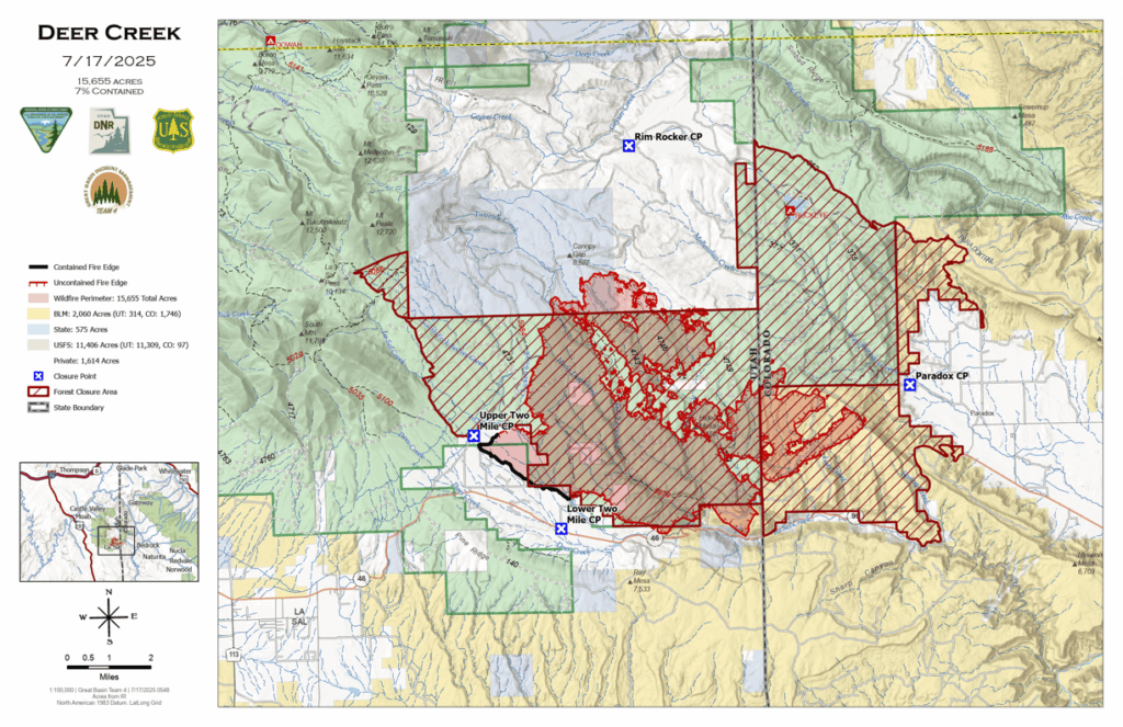 The Deer Creek Fire has grown to 15,655 acres and remains 7% contained as firefighters continue battling the blaze that started July 10 near La Sal. The fire remains active on the north and east sides, with 451 personnel deployed including 6 helicopters, 24 engines, 10 crews, and 5 dozers.