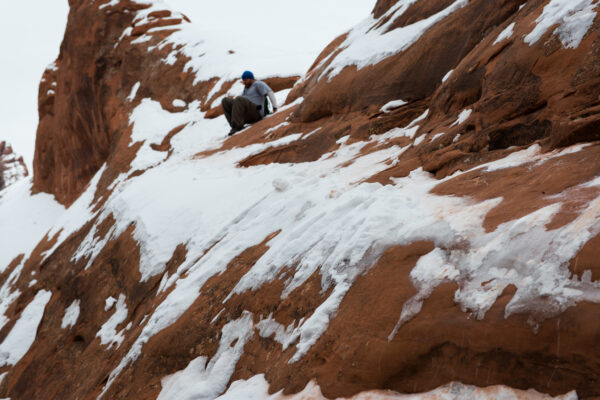 A hiker carefully traverses a portion of the Devils Garden Primitive Trail near Private Arch in Arches National Park. Winter hiking in Arches National Park can be a treacherous combination of ice, snow…